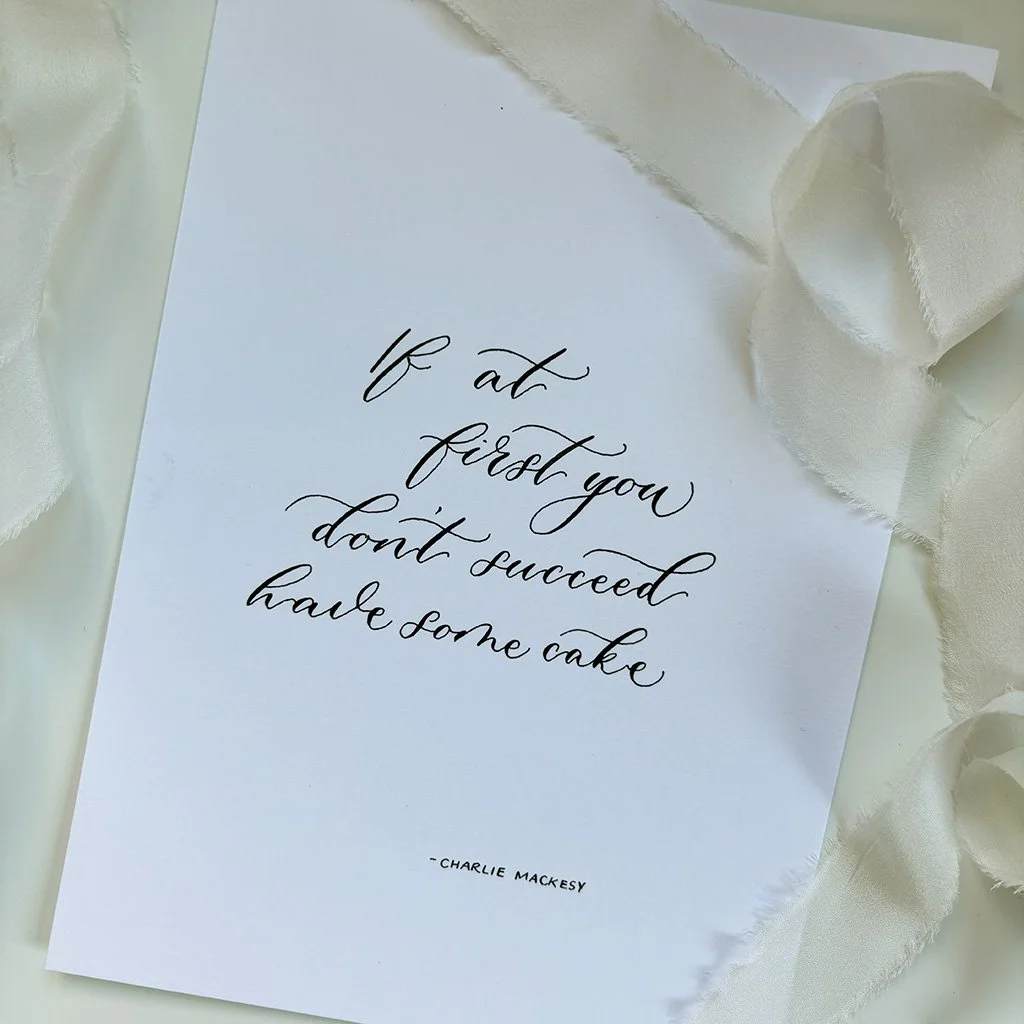 An A5 modern calligraphy print featuring the phrase ‘If At First You Don't Succeed Eat Cake’ by Charlie Mackesy.