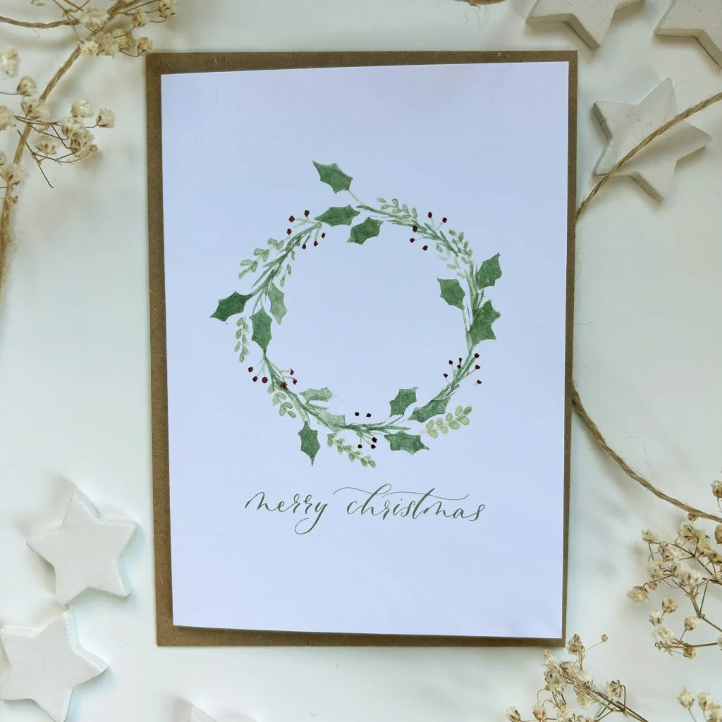 A pack of 4 watercolour Christmas cards featuring 4 designs, each finished with modern calligraphy.